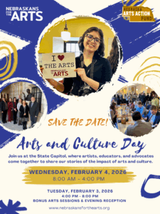 Join Nebraskans for the Arts for Arts and Culture Day in Lincoln, Nebraska, on February 4, 2026, with networking opportunities the evening of February 3.